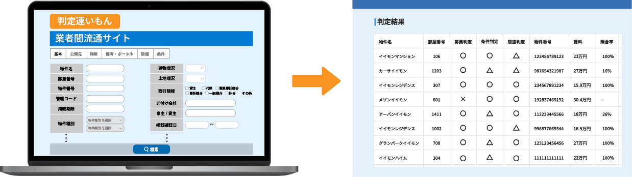 物確速いもんは複数の業者間サイトの物件情報を1画面にまとめ1クリックで「新着」「条件変更」の物件出しができるサービスです。判定速いもんと併せて使うと業者間サイトとポータルサイトの両方から物件情報の確認ができ、より正確な情報で物件を掲載できます。