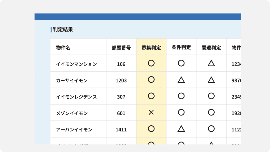オーナー様からの連絡漏れにも対応!今まで毎回電話でオーナー様に確認していた「募集状況」「条件変更」、掲載停止のリスクがある「入力間違い」を1クリックで判定できるツールです。