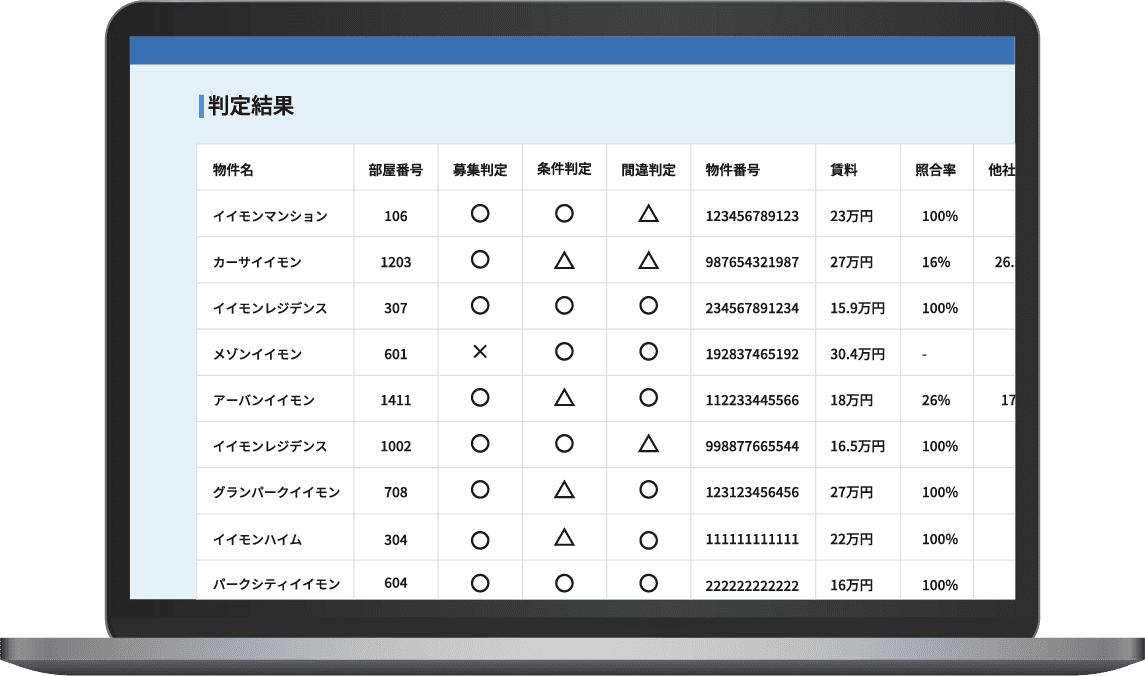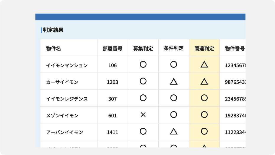 防げる他社掲載物件データを比較し、掲載ミスの可能性を判定。他社との照合率もわかり割合が低いと掲載ミスの可能性が高い項目がわかり、入力間違いによる広告掲載停止のリスクを減らすことができます。
